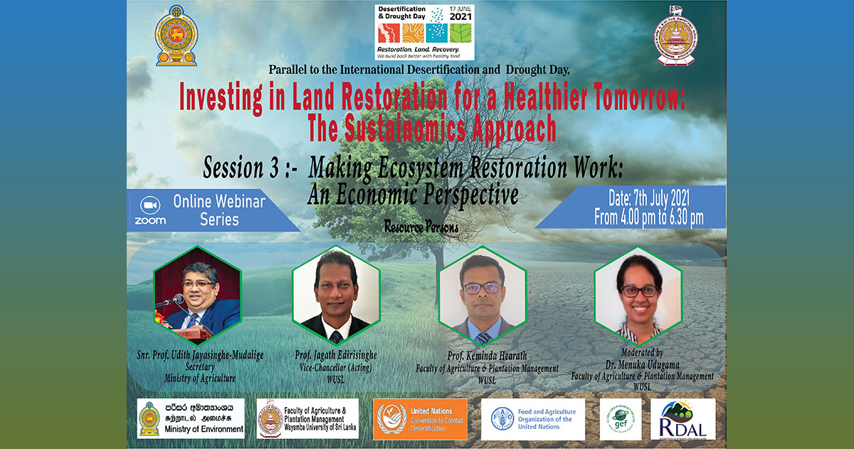 Join the Webinar Session 3 on World Desertification and Drought Day Webinar Series, 2021 by FAPM-WUSL with MOA The Faculty of Agriculture and Plantation Management of Wayamba University of Sri Lanka (FAPM-WUSL) with Ministry of Agriculture (MOA) proudly presents on “Making Ecosystem Restoration Work: An Economic Perspective” on Read More » July 4, 2021