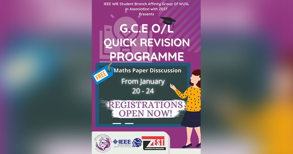 O/L mathematics quick revision program We the IEEE WIE student branch affinity group of the Wayamba University of Sri Lanka, Faculty of Applied Sciences were able to conduct a free O/L mathematics quick revision program Read More » September 28, 2021