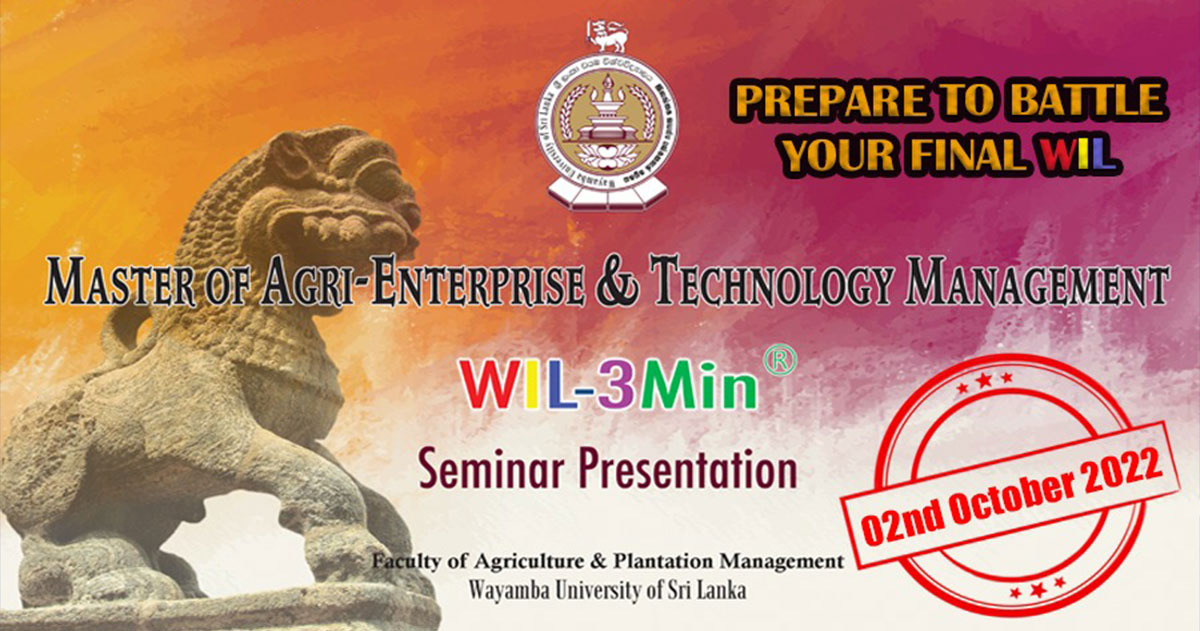 Launching WIL-3Min Seminar of M.AETM for the 3rd Consecutive Year at WUSL-FAPM The 3rd post-graduate student batch of M.AETM at Faculty of Agriculture and Plantation Management (FAPM) in WUSL is ready to battle their Work Integrated Learning (WIL) study on the 2nd Read More » September 23, 2022