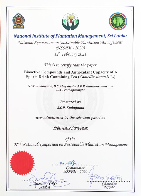 A research team from the Department of Plantation Management of Faculty of Agriculture and Plantation Management in Wayamba University of Sri Lanka (WUSL) innovated a new Sports Drink named “Wayamba SporTea” containing Tea. This innovation won the gold medal at the 2nd National Symposium on Sustainable Plantation Management, 2020 organized by National Institute of Plantation Management, as the best research paper titled Bioactive Compounds and Antioxidant Capacity of a Sports Drink Containing Tea (Camellia sinensis L.) appraising the meritorious work done by Ms. S.C.P. Kudagama, Prof. D.C. Abeysinghe, Dr. Gamika Prathapasinghe and Mr. A.D.R. Gunawardene.