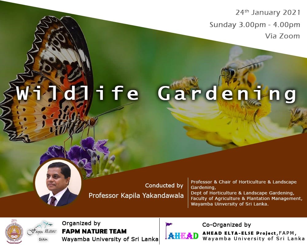 The Nature Team of Faculty of Agriculture and Plantation Management (FAPM) proudly presents to you a virtual session on “Wildlife Gardening” on the 24th January 2020, delivered by Prof. Kapila Yakandawala/ Professor and the Chair of Horticulture & Landscape Gardening.
