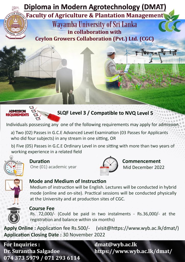 Hurry! The Diploma in Modern Agrotechnology is open for applications now. A new course matching the current national demand, offered by the Faculty of Agriculture and Plantation Management (FAPM) in Wayamba University of Sri Lanka (WUSL) jointly with Ceylon Growers Collaboration (Pvt.) Ltd. (CGC)
