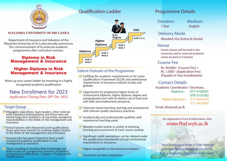 Applications Calling: Diploma in Risk Management & Insurance and the Higher Diploma in Risk Management & Insurance.