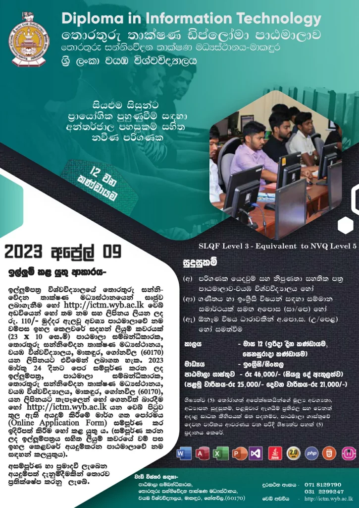Applications are open now for the 12th intake batch of the DIT offered by ICT Centre-Makandura of Wayamba University of Sri Lanka (WUSL). Deadline for application is 24 March 2023
