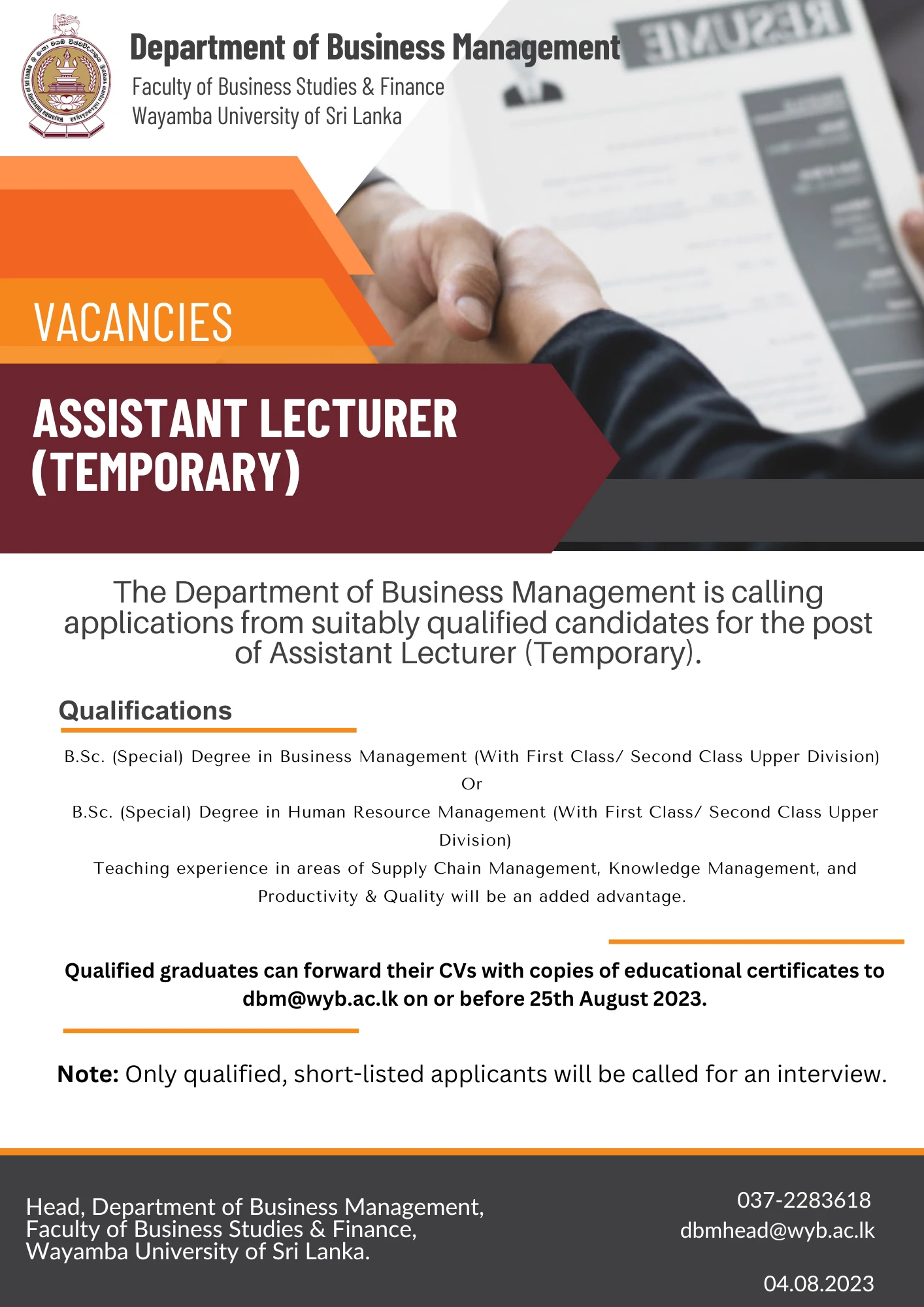 Assistant Lecturer (Temporary) – Department of Business Management