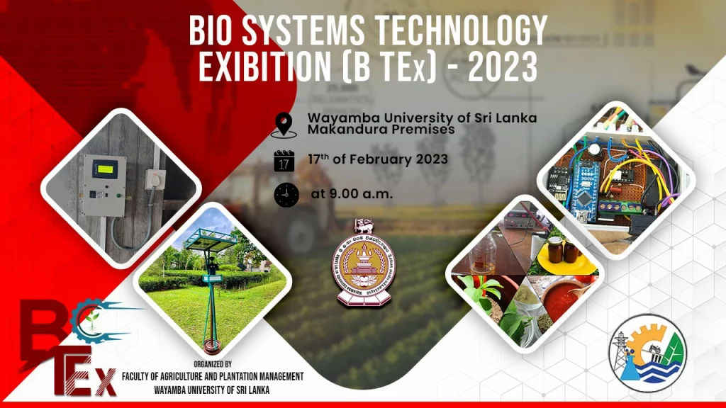 The BioSystems Engineering (BSE) students of the Faculty of Agriculture and Plantation Management (FAPM) in Wayamba University of Sri Lanka (WUSL) has organized “B-TEx 2023”, a technological exhibition to show case their inventions and products made by the undergraduates on 17th February 2023 at the Faculty premises, Makandura, Gonawilla.