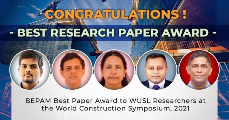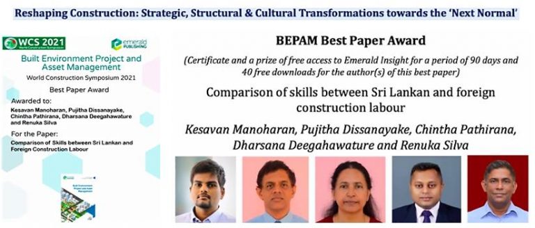 The research paper titled “‘Comparison of Skills between Sri Lankan and Foreign Construction Labour” lead-authored by Eng.(Mr.) M. Kesavan from Department of Construction Technology, Faculty of Technology, Wayamba University of Sri Lanka, and co-authored by Eng.(Dr.) P.B.G. Dissanayake from University of Peradeniya, Eng.(Dr.) C.K. Pathirana from University of Peradeniya, Prof. M.M.D.R. Deegahawature from Wayamba University of Sri Lanka and Prof. K.D.R. Silva from Wayamba University of Sri Lanka received the “Best Paper Award” offered by Built Environment Project and Asset Management (BEPAM) journal, Emerald Group Publishing at the 9th World Construction Symposium held on 8-9th July 2021.