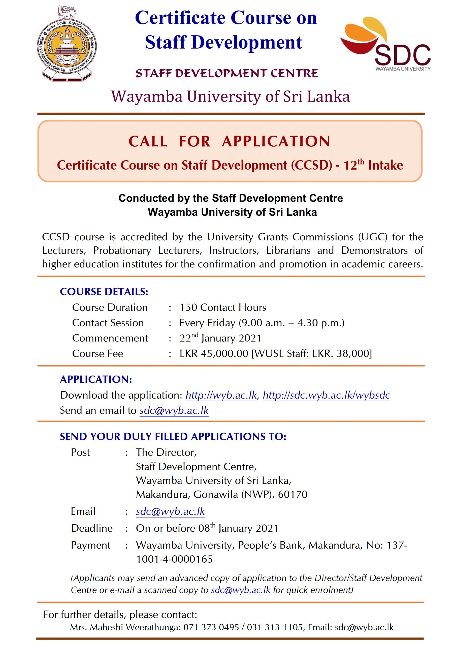 Certificate Course On Staff Development ( CCSD ) – 12th Intake: Calling Applications