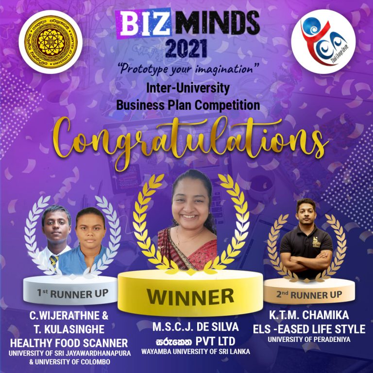 Ms. M.S.Chaya Janani De Silva, a final year student of the Department of Plantation Management of the Faculty of Agriculture and Plantation Management (FAPM), Wayamba University of Sri Lanka (WUSL) won the 1st place for her business idea on Organic Fertilizer with a Rs.25,000.00 cash price at the “BIZ MINDS”, 8th Inter-university Business Plan Competition organized by the Young Entrepreneurs Association of the University of Kelaniya (YEAUOK).