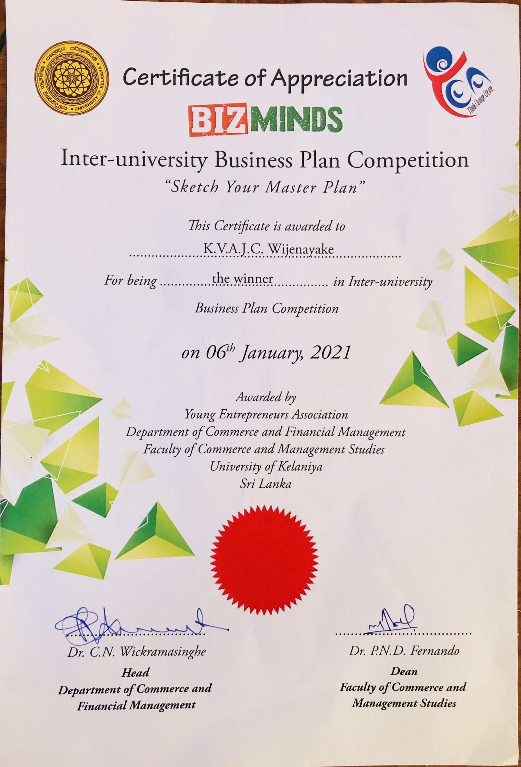 Ms. K.V.A.J.C.Wijenayake, a final year student of the Department of Business Management from the Faculty of Business Studies and Finance (FBSF) won the 1st place with a Rs.25,000.00 cash price at the “BIZ MINDS” 7 th Inter-university Business Plan Competition held on 06 th January 2021 by the Young Entrepreneurs Association of the University of Kelaniya (YEAUOK). Ms. Wijenayake’s business idea was also the winner at the “WAYA Ventures 2020” held by the Wayamba University of Sri Lanka (WUSL), previously. Congratulations Ms. Ms. K.V.A.J.C.Wijenayake!