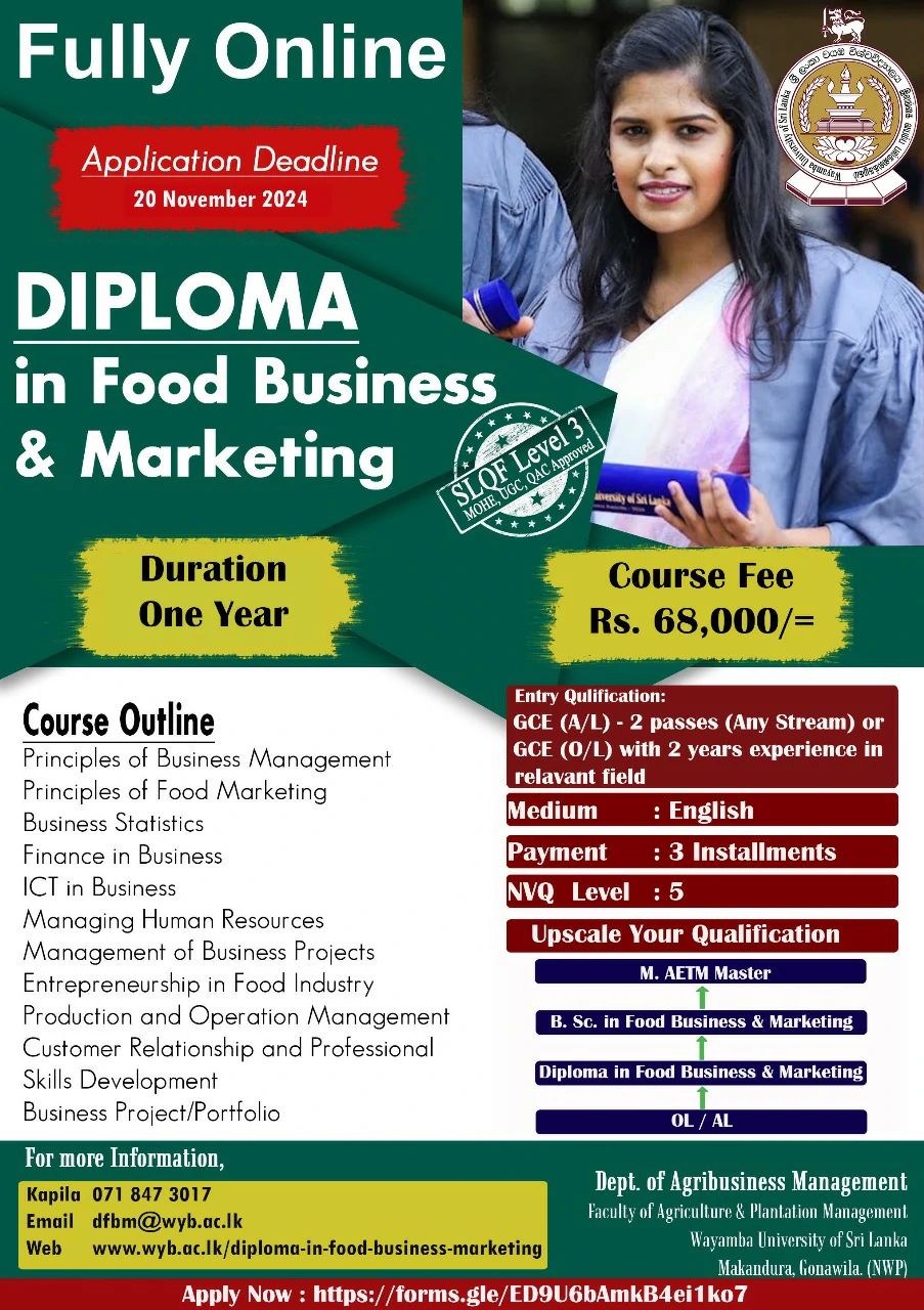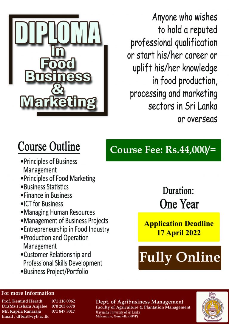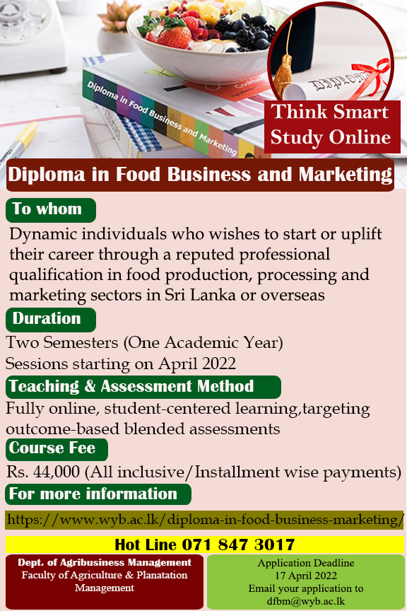 The ‘Diploma in Food Business & Marketing (DFBM) provides an enhanced understanding of economic, management and marketing related aspects of food businesses, both in terms of technical subject matter and overall management skills. This is a professional qualification for anyone interested to start their career or improve his/her knowledge in food production, processing and marketing sectors in Sri Lanka or overseas. It will develop participants’ understanding of the fundamental theories and practices linked to efficient and effective administration and management of various types of food businesses in Sri Lanka.