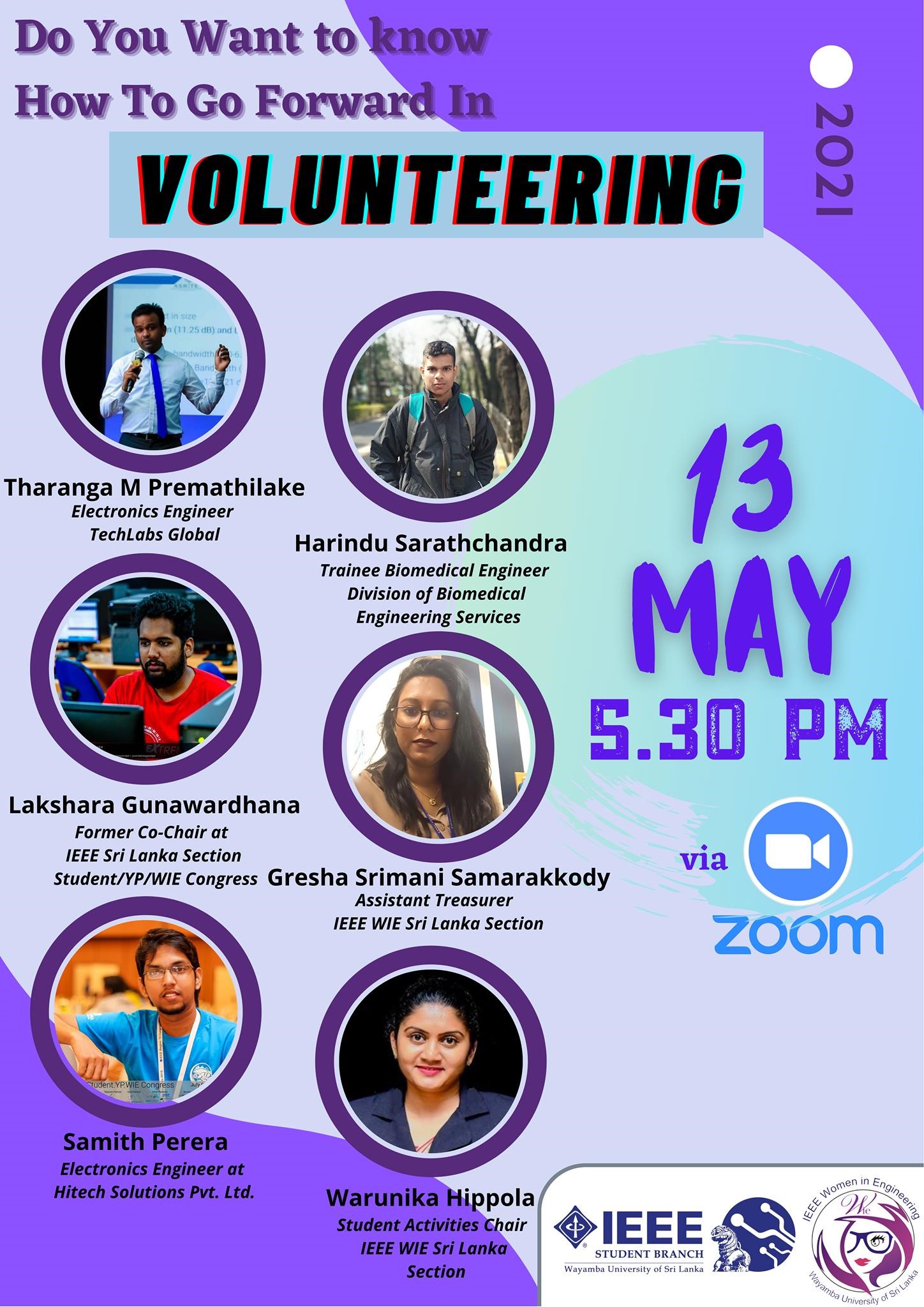 The session was constituted with a panel of speakers. The panel consisted of Mr. Samith Chathuranga Perera, Former Vice Chairman at IEEE Young Professionals Sri Lanka, Mr. Tharanga Premathilake, Former Chairman at IEEE Wayamba University of Sri Lanka Student Branch, Ms. Warunika Hippola, Student Representative at IEEE Region 10, Ms. Gresha Srimani Samarakkody, Assistant Treasurer at IEEE WIE Sri Lanka Section, Mr. Harindu Sarathchandra, Former Chairman at IEEE Wayamba University of Sri Lanka Student Branch, Mr. Lakshara Gunawardhana, Co-chair for the IEEE Sri Lanka Section Student Young Professional Women in Engineering Congress 2020.
