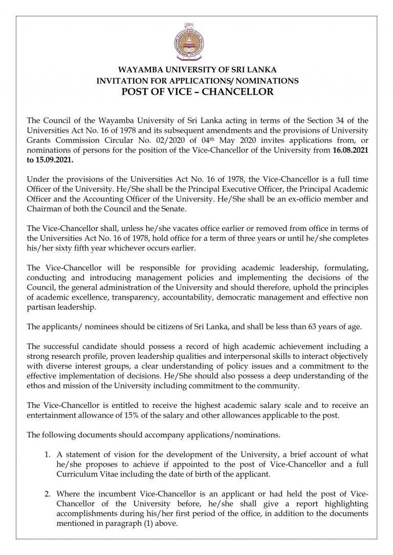 INVITATION FOR APPLICATIONS/ NOMINATIONS POST OF VICE – CHANCELLOR