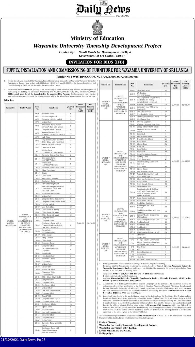 Invitation for Bids (IFB): Supply, Installation and Commissioning of Furniture for Wayamba University of Sri Lanka