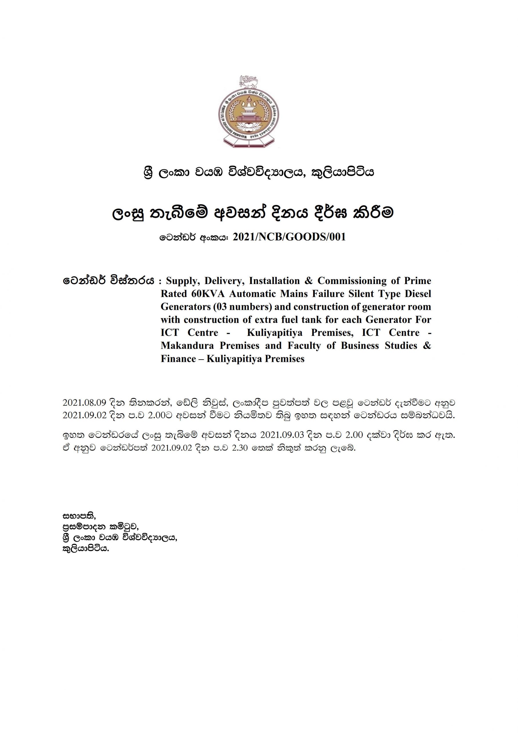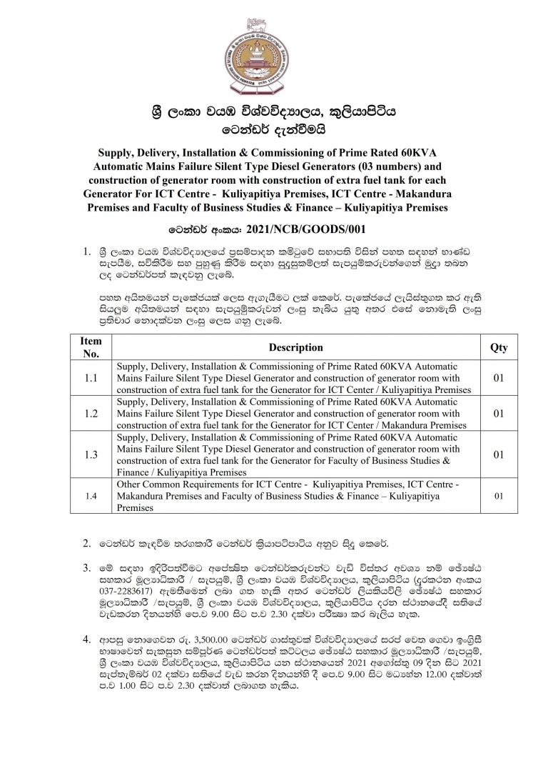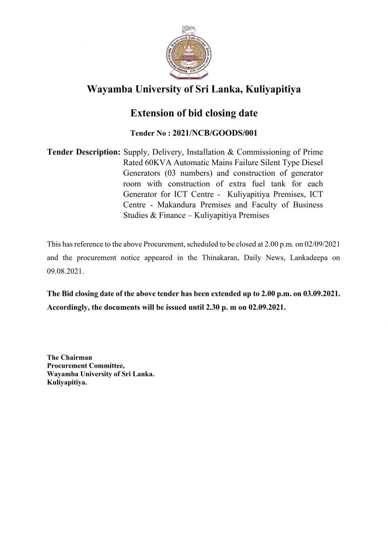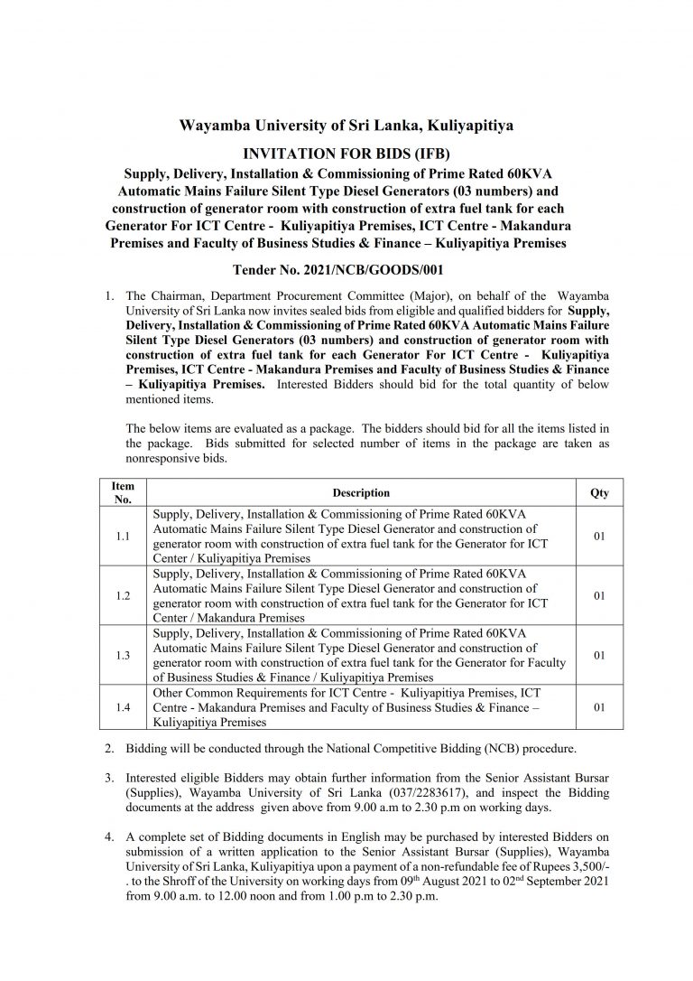 Supply, Installation and commissioning of Air Conditioners for Wayamba University of Sri Lanka