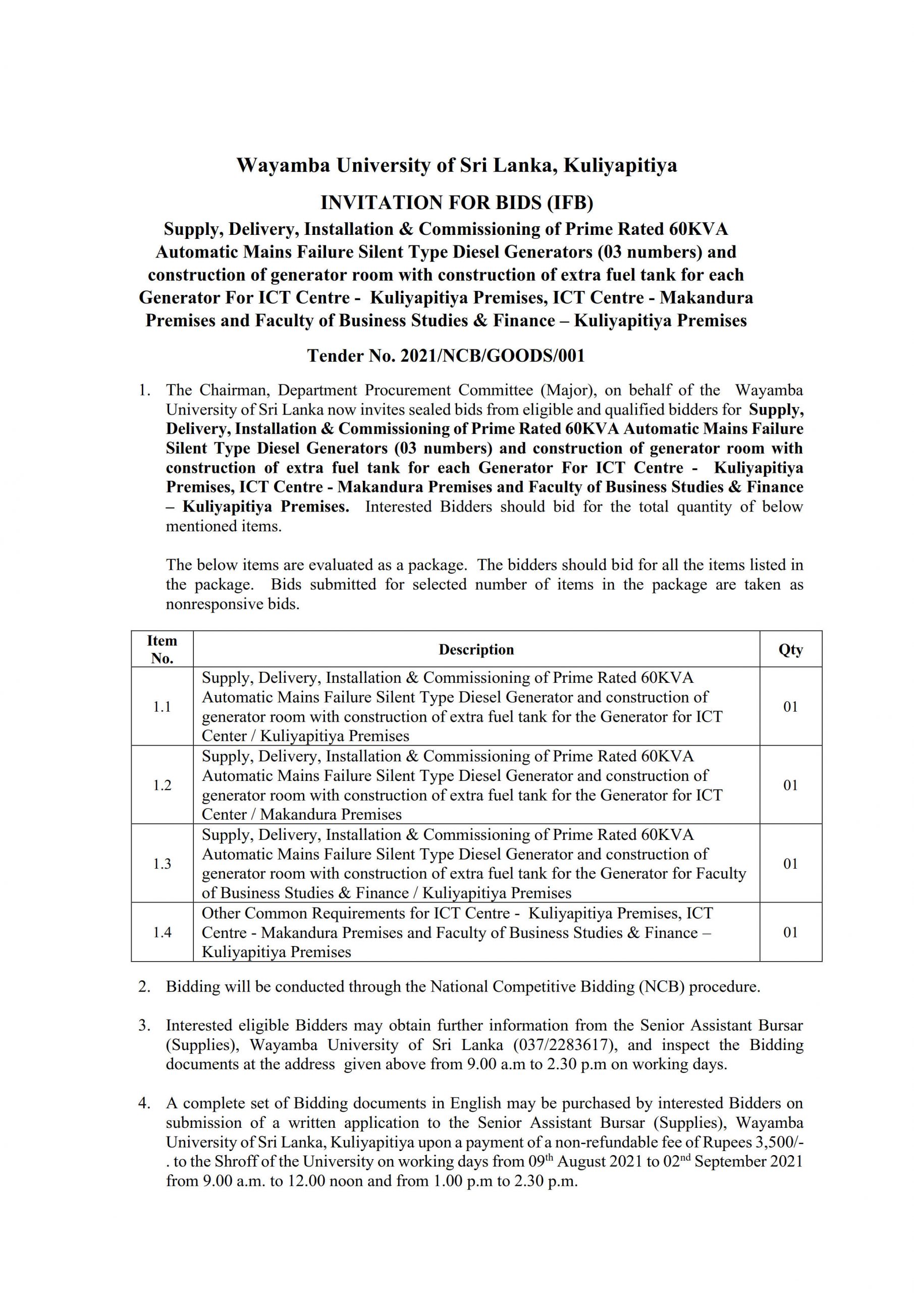 INVITATION FOR BIDS (IFB) : Tender No. 2021/NCB/GOODS/001