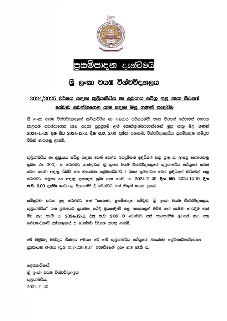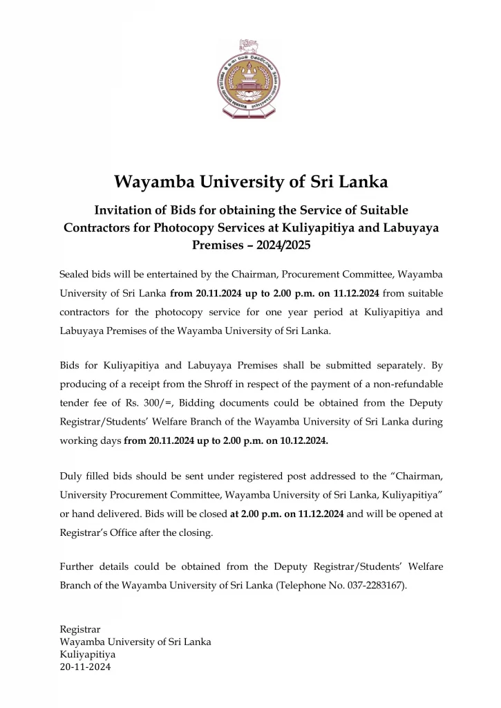 Invitation of Bids for obtaining the Service of Suitable Contractors for Photocopy Services at Kuliyapitiya and Labuyaya Premises