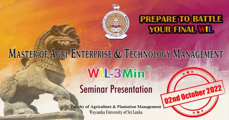 The 3rd post-graduate student batch of M.AETM at Faculty of Agriculture and Plantation Management (FAPM) in WUSL is ready to battle their Work Integrated Learning (WIL) study on the 2nd October 2022 at the Faculty Auditorium. They will be presenting their enterprise ideas, concepts and case evaluations across a range of agriculture industries. Wish you all the best students and be ready!