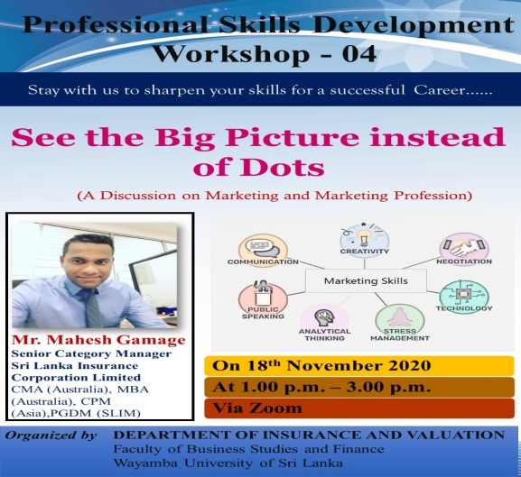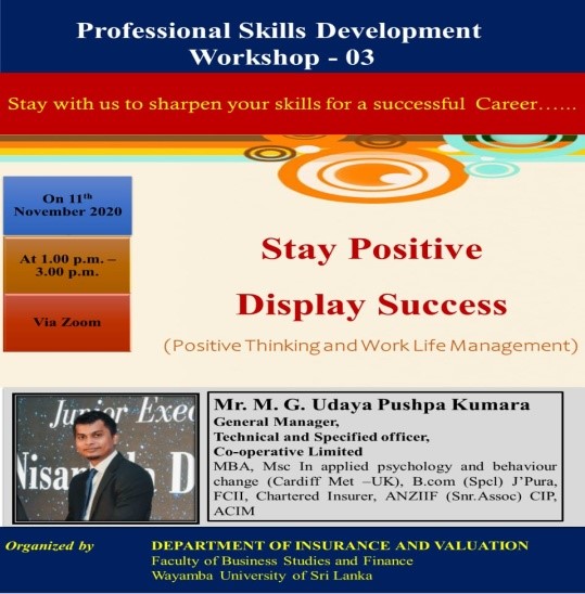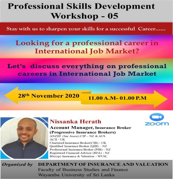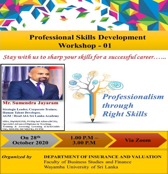 The Department of Insurance and Valuation in the Faculty of Business Studies and Finance (FBSF) of Wayamba University of Sri Lanka (WUSL) organized a series of workshops from October to November 2020 to the undegraduate students to develop their professional skills by meeting the experts in the insurance industry. The Department believes that these workshops paved the way for the students to become successful professionals in the insurance industry. Below workshop titles were covered during the series;