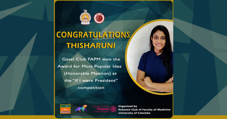 Congratulations! Gavellier Thisharuni Samarawickrama, a final year student from the Faculty of Agriculture and Plantation Management (FAPM) of Wayamba University of Sri Lanka (WUSL) won the “Most Popular Idea Award” at the competition – “If I were President” organized by Rotaract Club of Faculty of Medicine, University of Colombo on the 1st of June 2021. FAPM Gavel Club is a students’ club open for all the undergraduates to support their English speaking skills. Well done! club and keep continuing the good work.