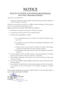 POST OF ACADEMIC SUB WARDEN (MALE/FEMALE) Makandura Premises