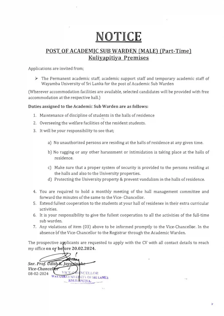 POST OF ACADEMIC SUB WARDEN (MALE) (Part-Time) Kuliyapitiya Premises