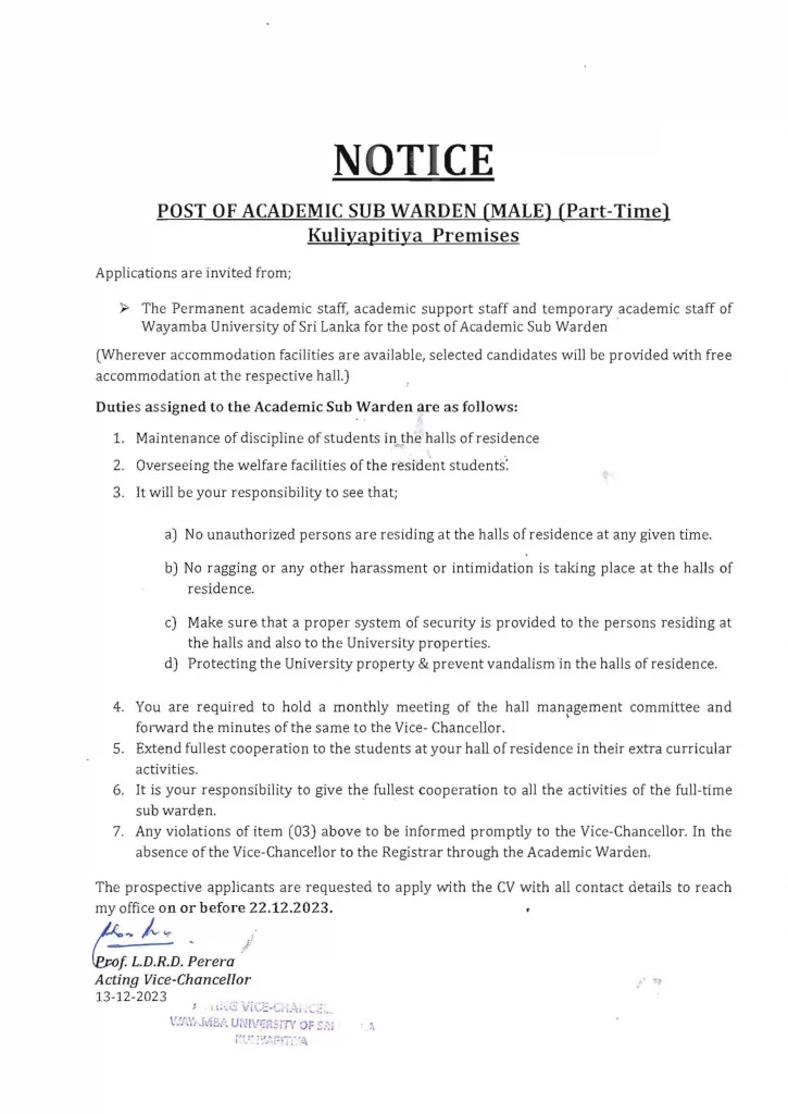 POST OF ACADEMIC SUB WARDEN (MALE) (Part-Time) Kuliyapitiya Premises