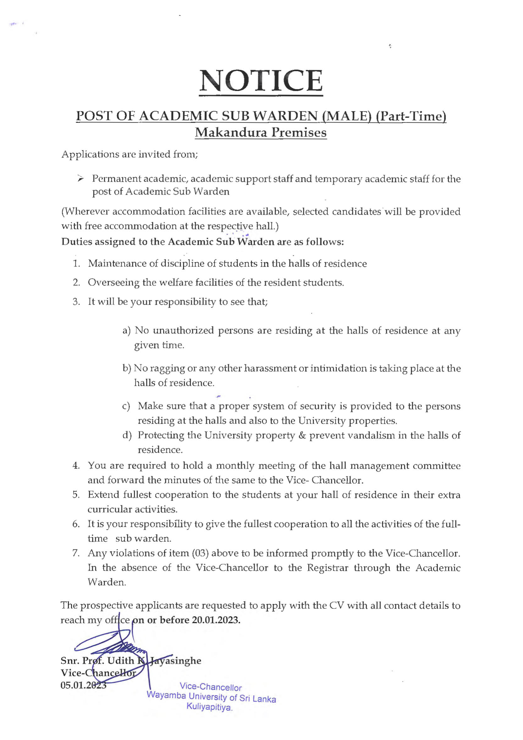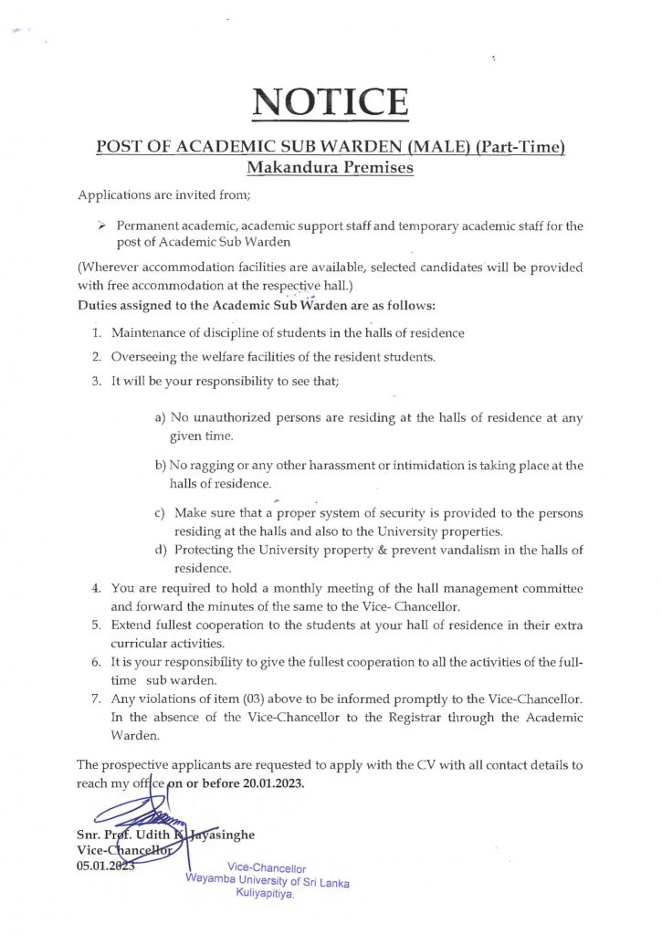 Post of Academic Sub Warden (Male) (Part-time) – Makandura