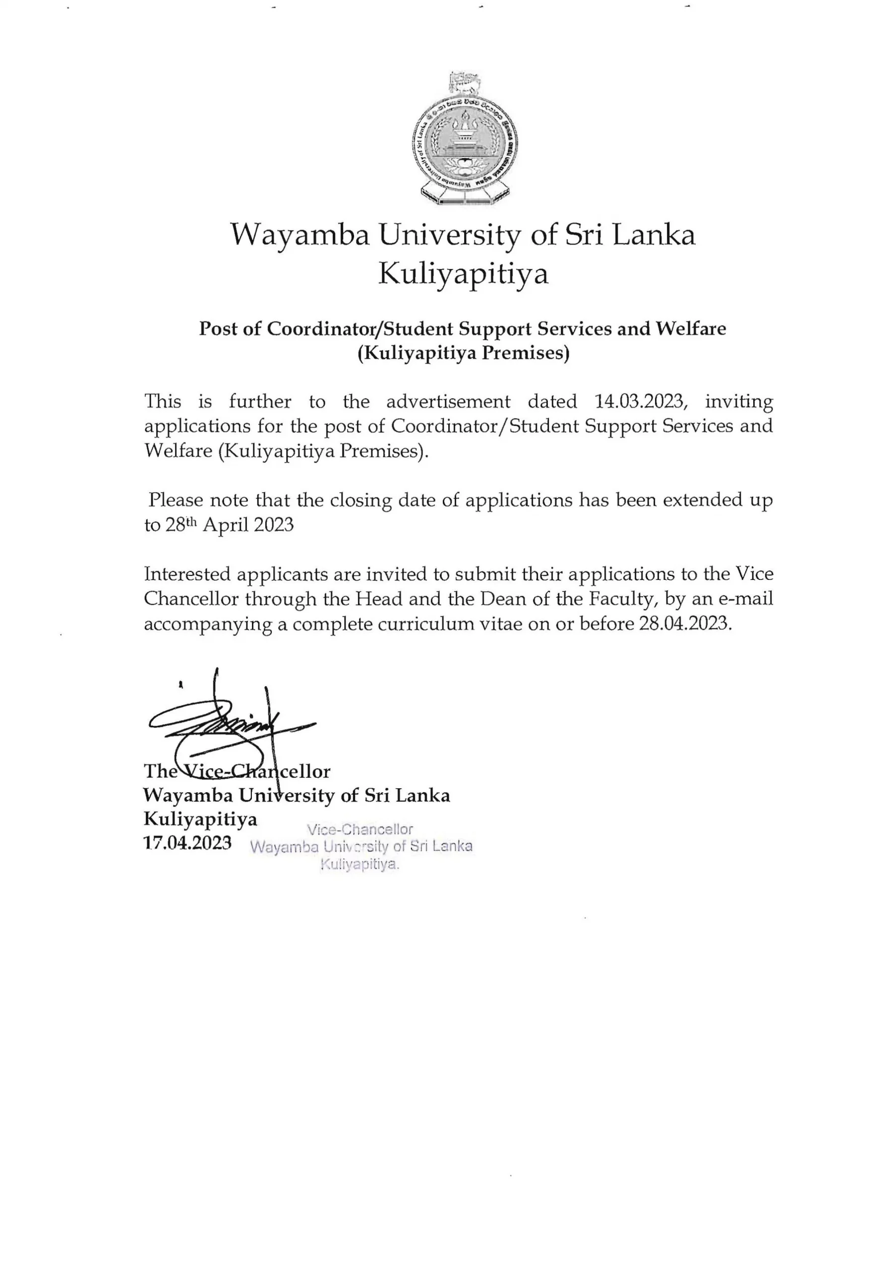 Post of Coordinator, Student Support Service and welfare(Kuliyapitiya Premises)