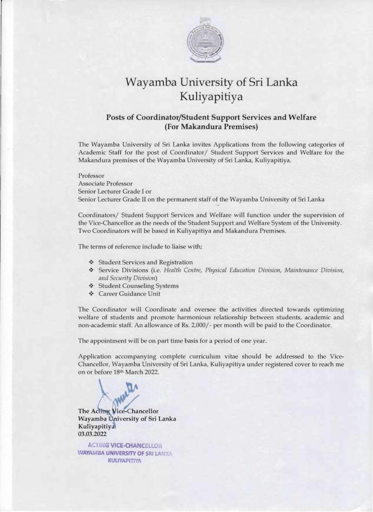 Post of Coordinator/Student Support Services and Welfare – Makandura