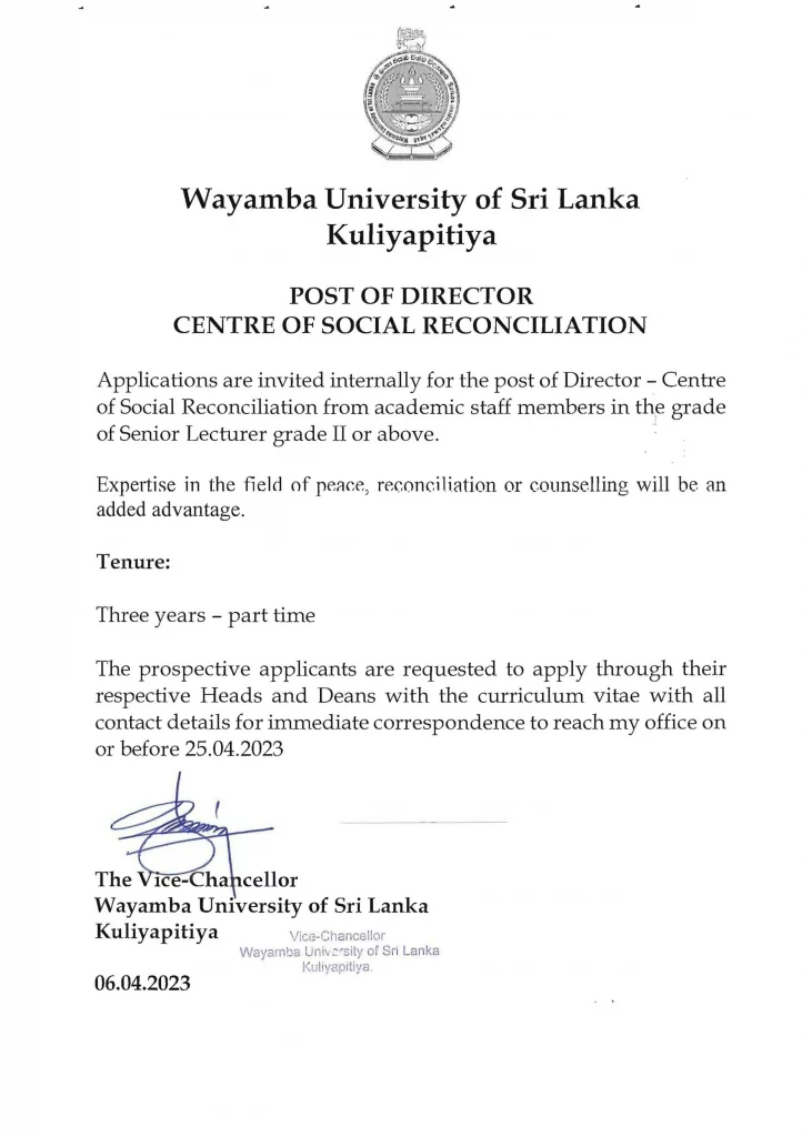 Post of Director, Centre of Social Reconciliation Kuliyapitiya Premises