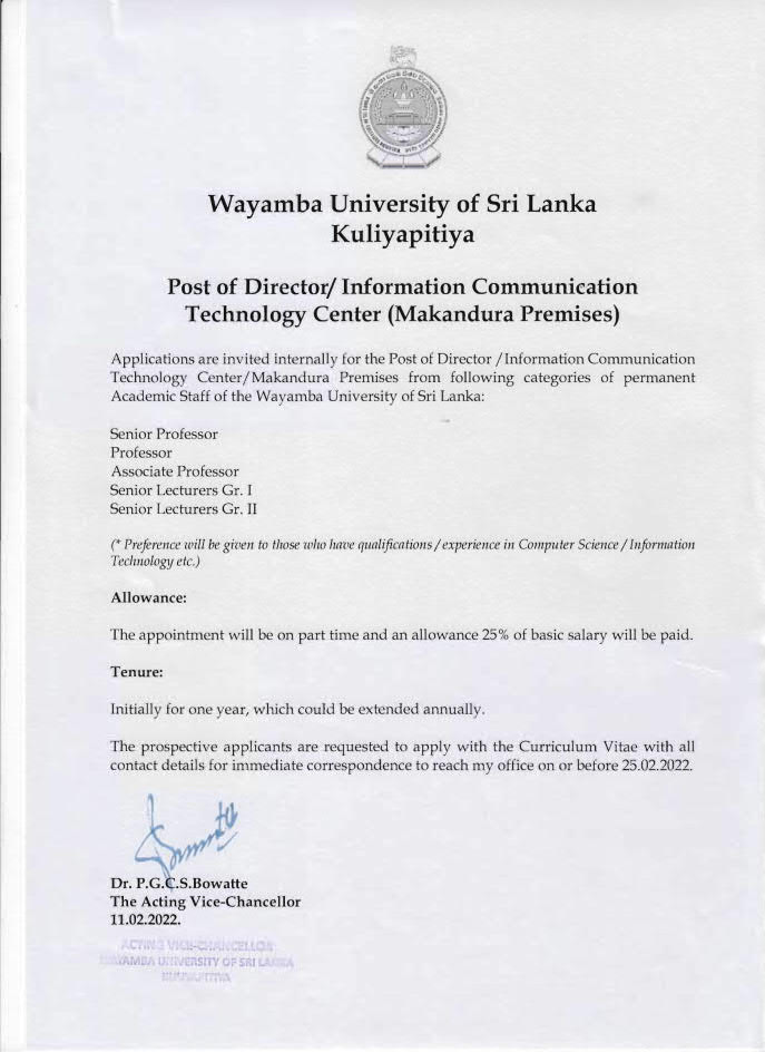 Post of Director ICT Center – Makandura – Kuliyapitiya
