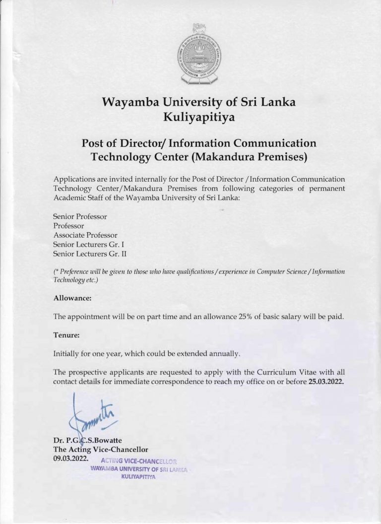 Post of Director – ICT Center Makandura Premises