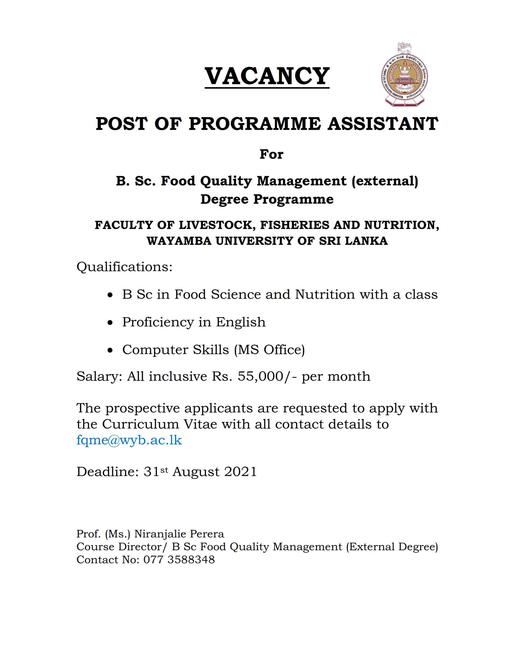 Post of Programme Assistant for B.Sc. Food Quality Management (external)Degree Programme