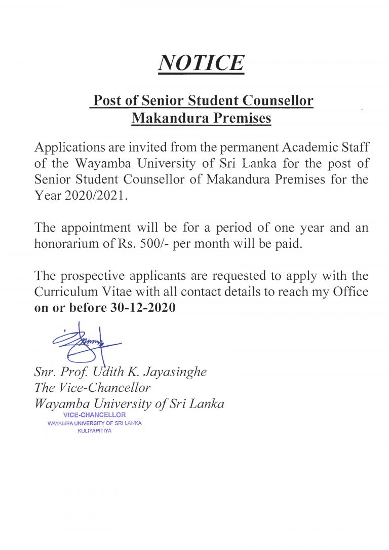 Post of Deputy Proctor (Faculty of Plantation Management)