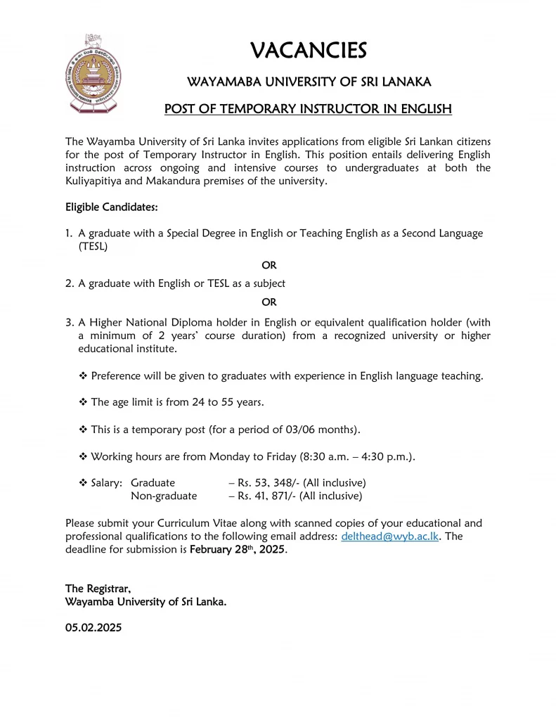 POST OF TEMPORARY INSTRUCTOR IN ENGLISH
