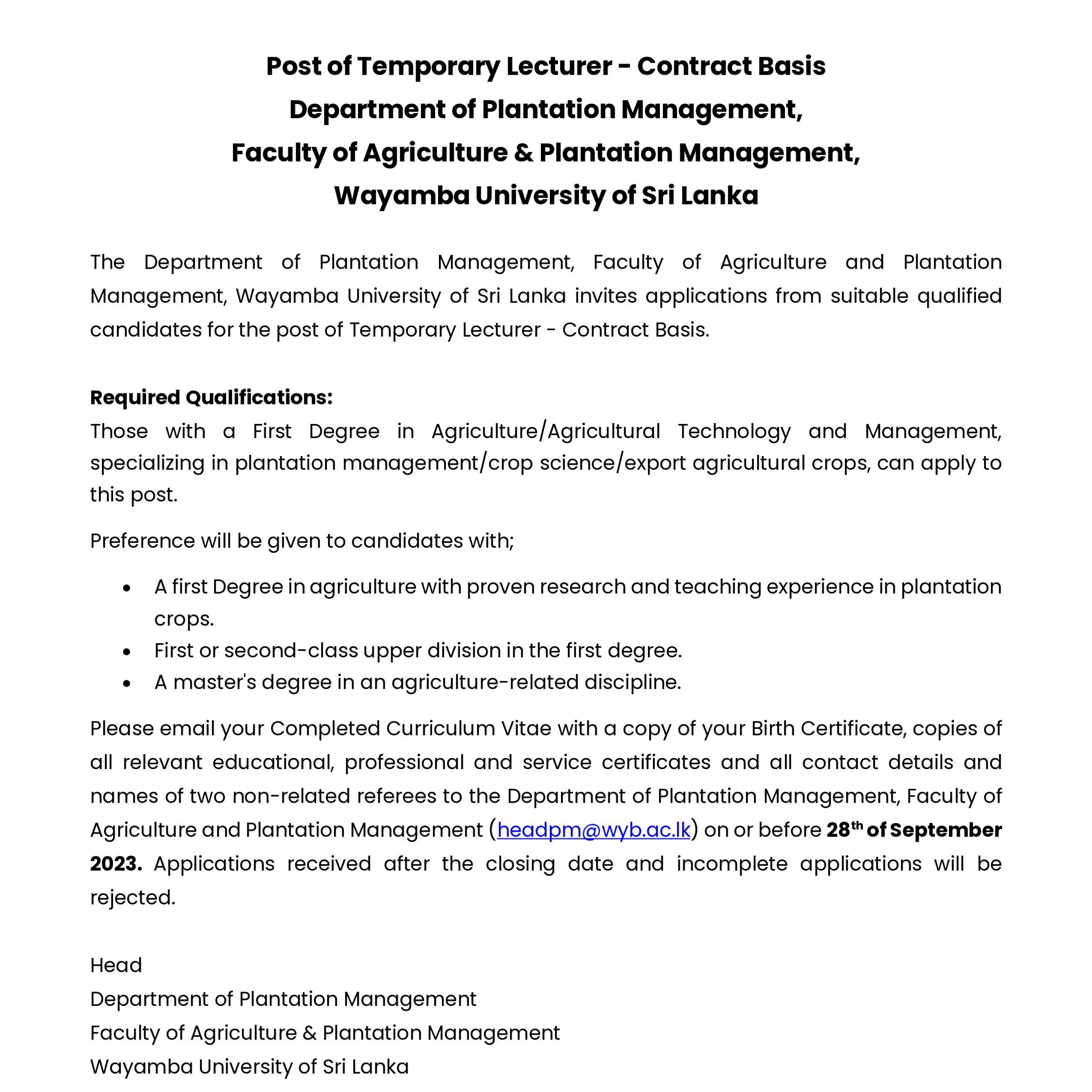 Post of Temporary Lecturer – Contract Basis Department of Plantation Management