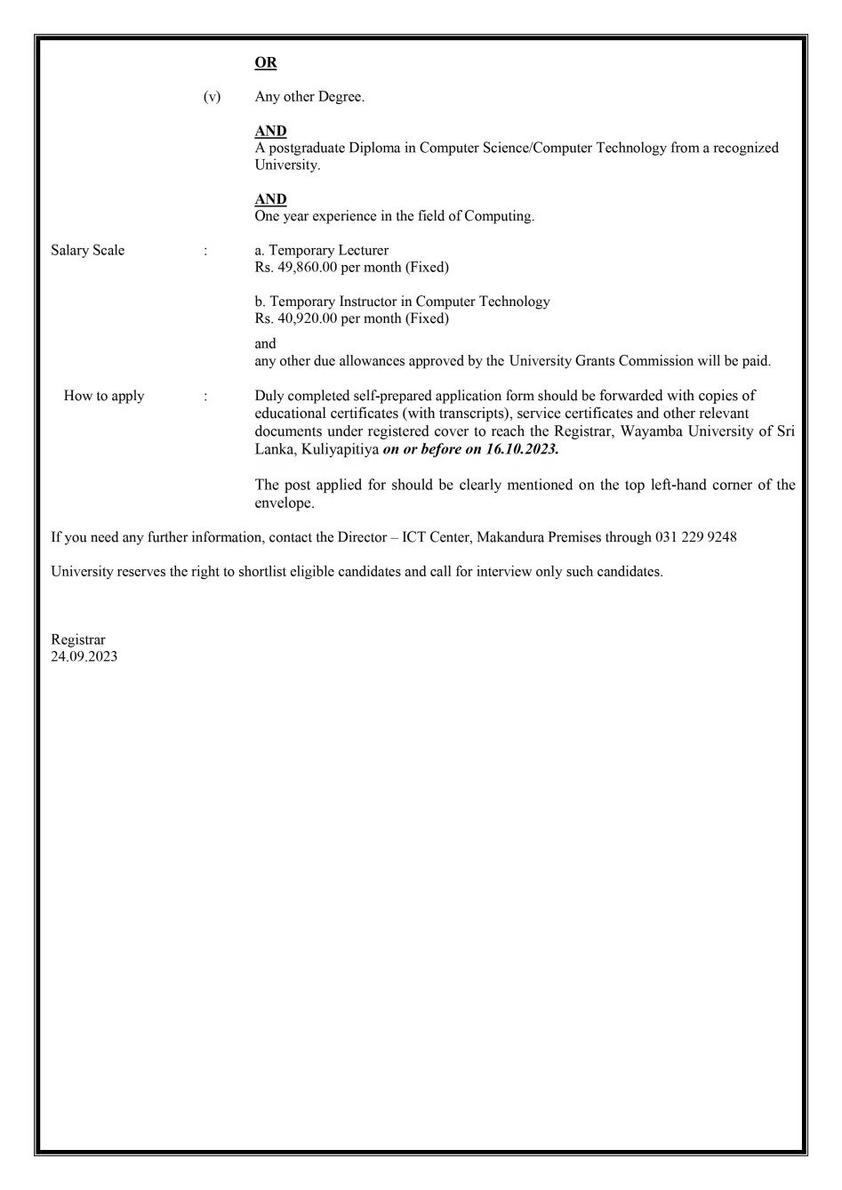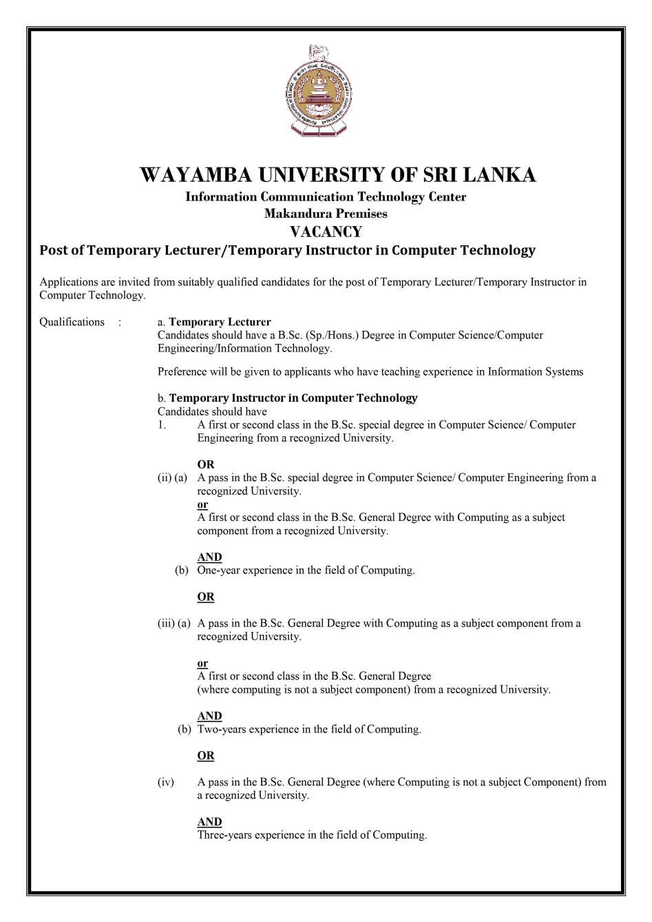 Post of Temporary Lecturer/Temporary Instructor in Computer Technology