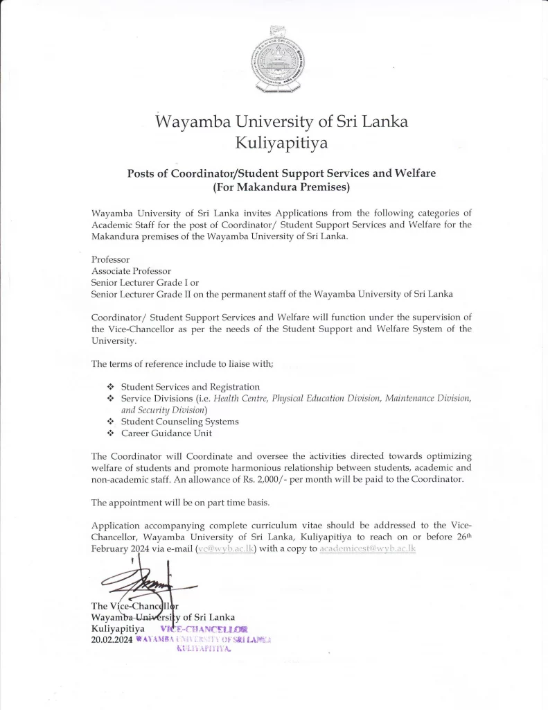 Posts of Coordinatoy’Sfudent Support Services and Welfare (For Makandura Premises)