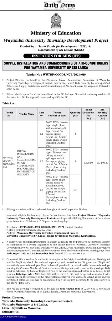 Supply, Installation and commissioning of Air Conditioners for Wayamba University of Sri Lanka