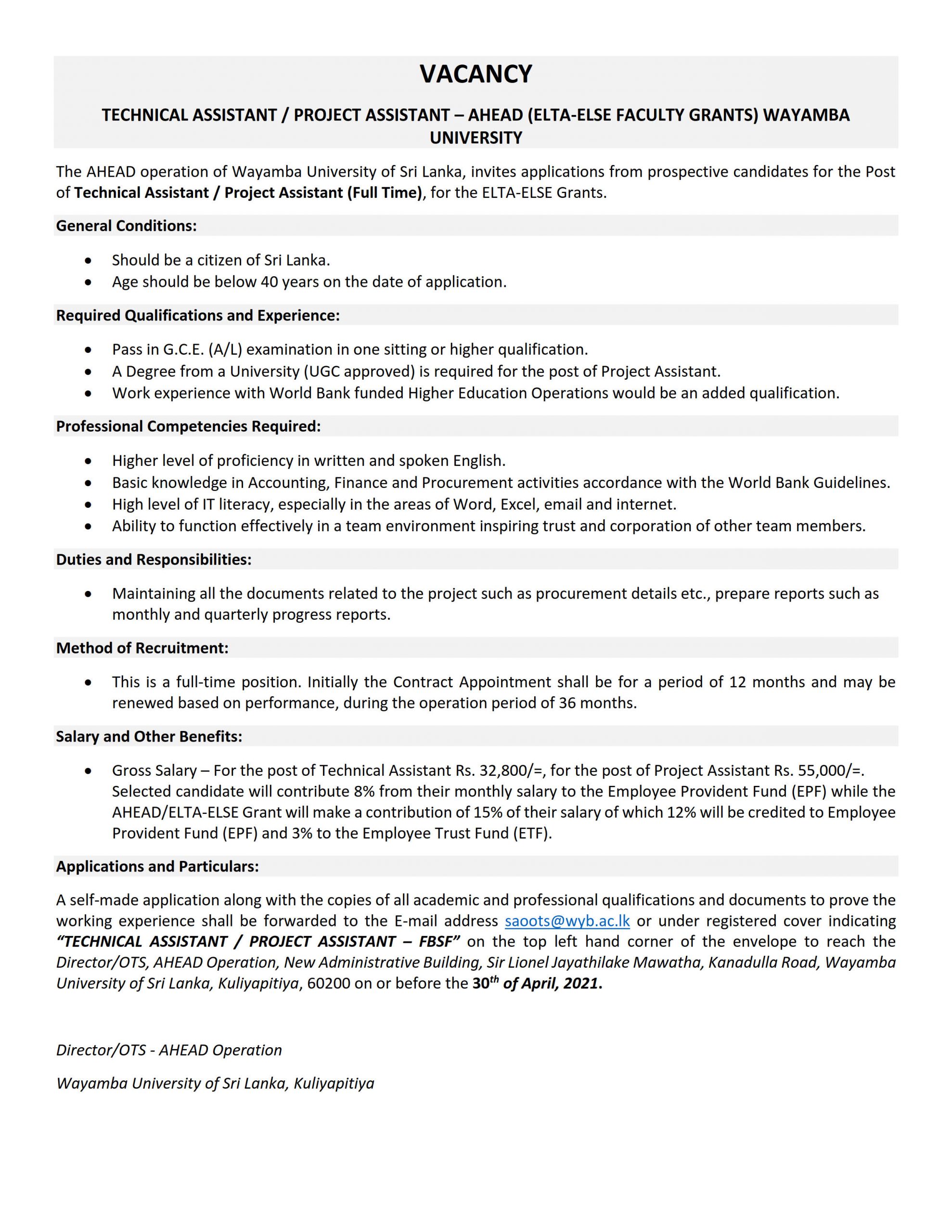 Technical Assistant / Project Assistant – AHEAD (ELTA-ELSE Faculty Grants)