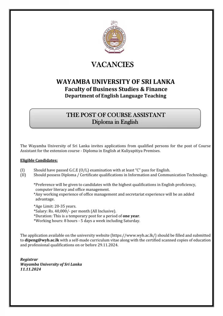 THE POST OF COURSE ASSISTANT – Diploma in English