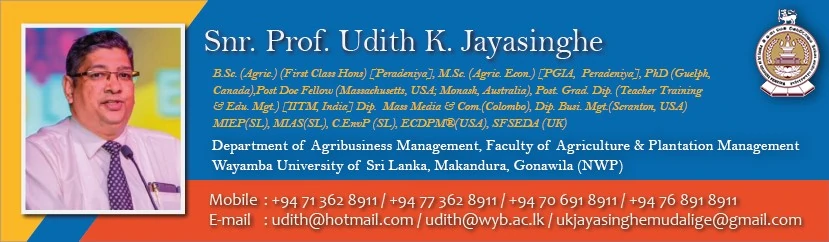 Senior Prof. Udith K Jayasinghe was appointed as the 6th Vice-Chancellor of the Wayamba University of Sri Lanka (WUSL) and he assumed duties on 08 September 2020. He holds the posts of Senior Professor and the Chair of Department of Agribusiness Management, Faculty of Agriculture & Plantation Management of the WUSL and carries an excellent track record as an academician, researcher, expert consultant and social worker. Prof. Jayasinghe has taken up the challenge of steering the WUSL to greater vistas in the face of the current world crisis. His vision is to make it the “Best National University Focusing on Undergraduate Education”.