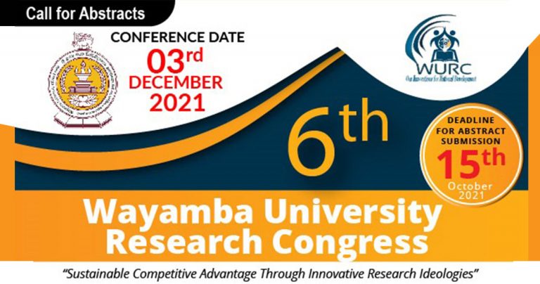 The sixth Wayamba University Research Congress under the theme “Sustainable Competitive Advantage Through Innovative Research Ideologies” will be held on 03rd December. The event is organized by the Senate Research and Higher Degrees Committee (SRHDC) of the University.
