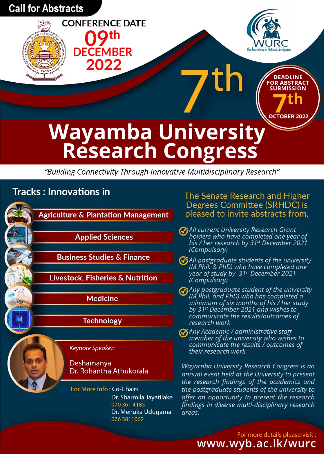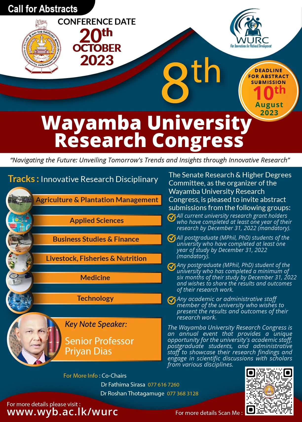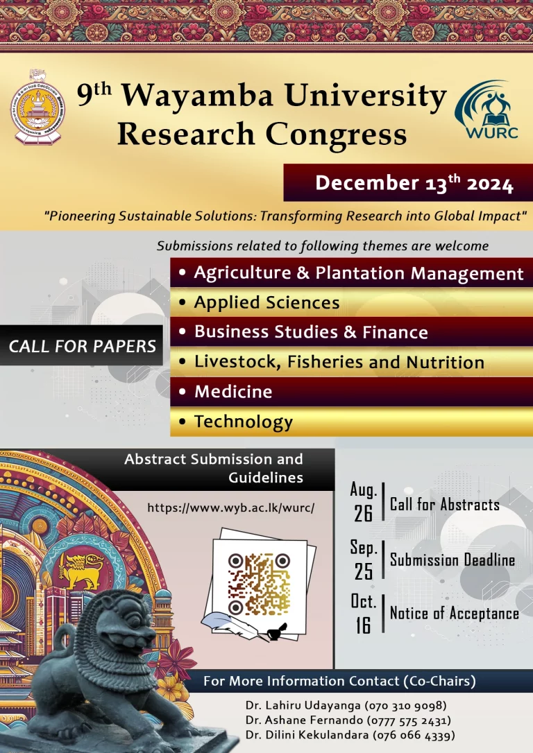 Welcome to the official webpage of the Wayamba University Research Congress (WURC) 2025! The WURC holds great significance within the academic calendar of the Wayamba University of Sri Lanka. It serves as a valuable platform for academics, administrative staff, and postgraduate students to share the findings of their research projects.