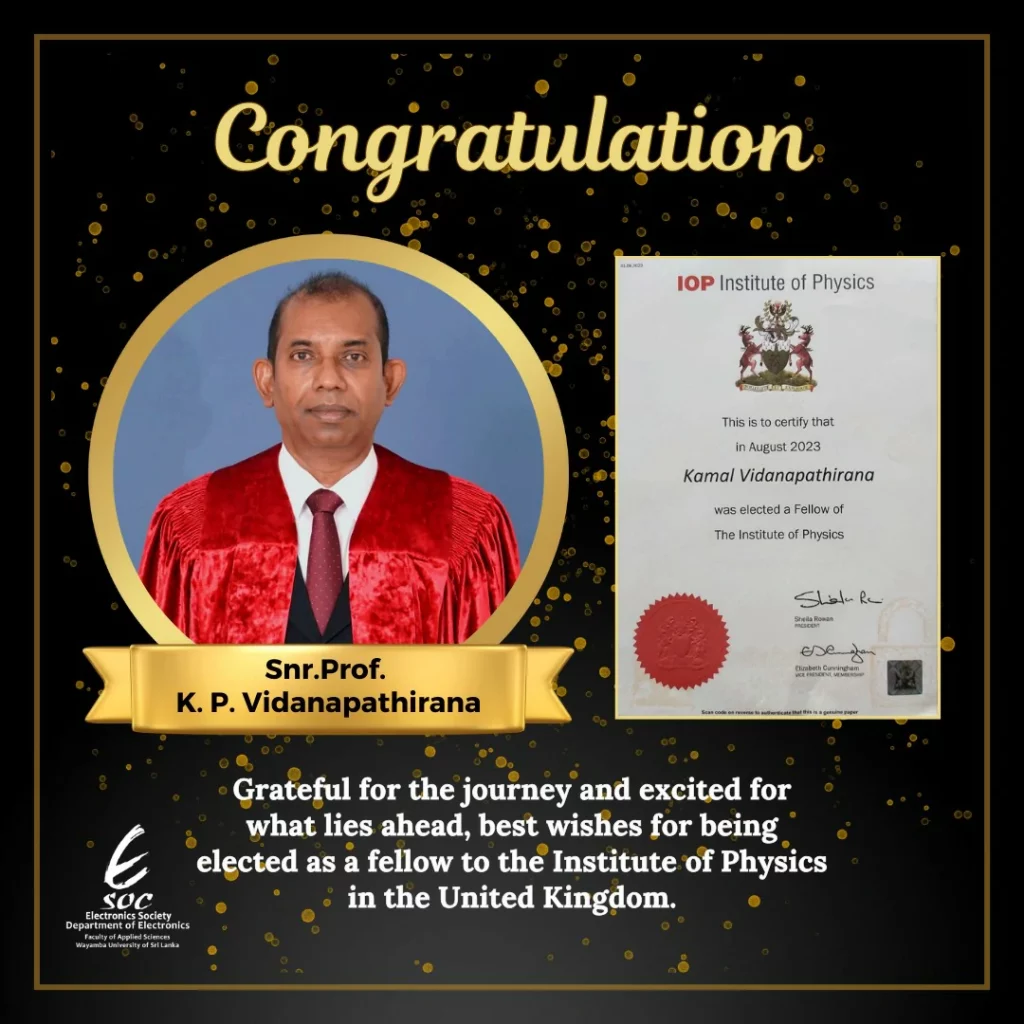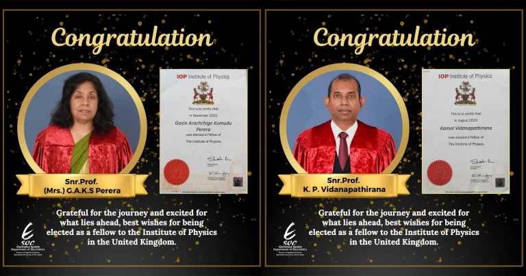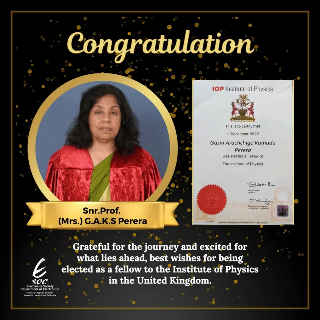 Congratulations to Snr. Prof K.P.Vidanapathirana and Snr.Prof.(Mrs.) G.A.K.S. Perera on their well-deserved election as fellows to the Institute of Physics in the United Kingdom Your achievements inspire all of us. Cheers to a future filled with continued success and groundbreaking discoveries!