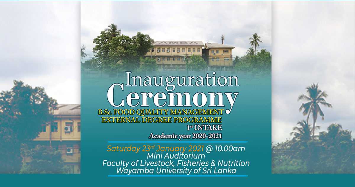 1 st Intake of B.Sc. Food Quality Management (External) Degree Programme to be Inaugurated The new B.Sc. Food Quality Management (External) degree offered by the Faculty of Livestock, Fisheries and Nutrition (FLFN) in Wayamba University of Sri Lanka (WUSL), jointly with Standards Institute of Read More » January 22, 2021