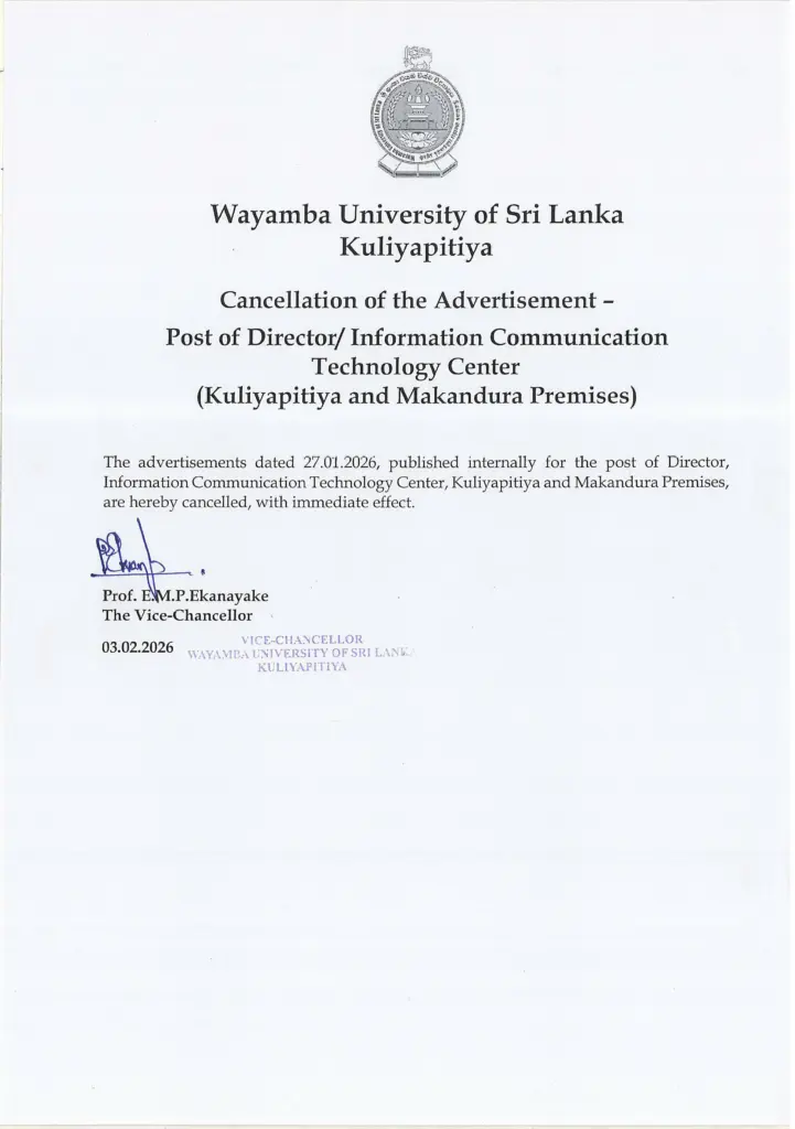 cancellation of the vacancy notice for the post of Director – ICTC, Kuliyapitiya and Makandura Premises