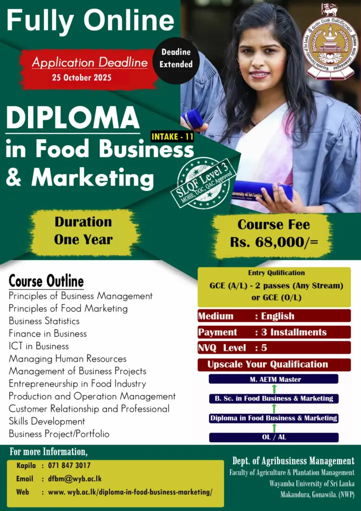 The ‘Diploma in Food Business & Marketing (DFBM) provides an enhanced understanding of economic, management and marketing related aspects of food businesses, both in terms of technical subject matter and overall management skills. This is a professional qualification for anyone interested to start their career or improve his/her knowledge in food production, processing and marketing sectors in Sri Lanka or overseas. It will develop participants’ understanding of the fundamental theories and practices linked to efficient and effective administration and management of various types of food businesses in Sri Lanka.
