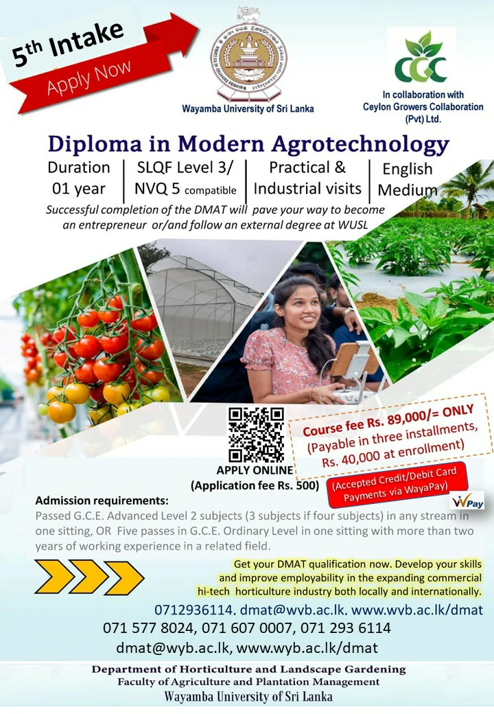 The Diploma provides an enhanced understanding of the concepts, design and technology related to commercial scale crop production in controlled environments. It will serve as a professional qualification for individuals who are interested in starting a commercial horticulture business with modern agricultural technologies. The Diploma will also offer prospective candidates with an opportunity to upgrade their career or uplift his/her knowledge in modern agricultural technologies required for controlled environment crop production / protected agriculture, which is the future of agriculture. The courses are highly practical oriented so that the participants will obtain hands on skills.